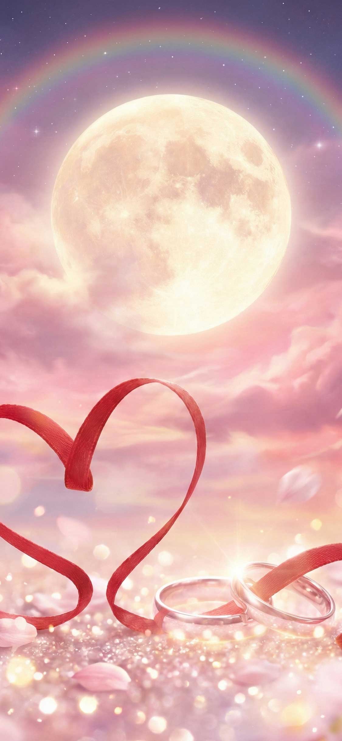 「満月」は物事の成就を、「虹」は奇跡を意味します。そこに運命の赤い糸である「リボン」がハートを描くことで、離れてしまった縁を強引にでも結び直すパワーを込めました。障害のある恋や、諦めかけている復縁に特化した最強のデザインです。