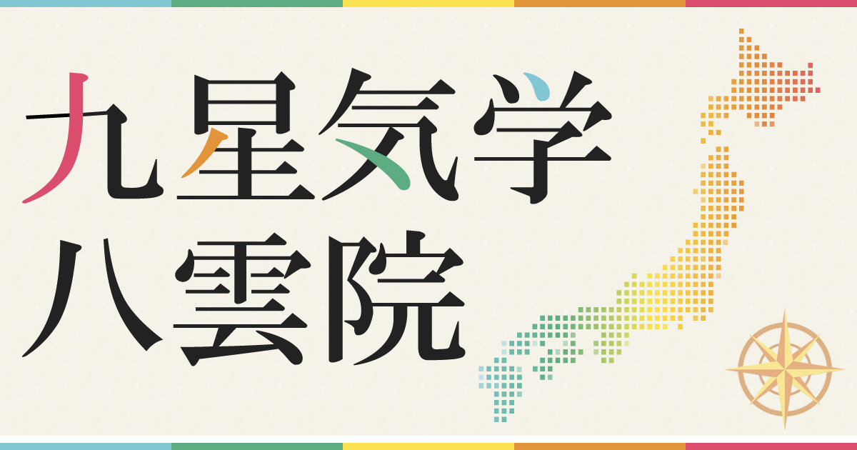 | 一白水星 | 二黒土星 | 三碧木星 | 四緑木星 | 五黄土星 | 六白金星 | 七赤金星 | 八白土星 | 九紫火星 |