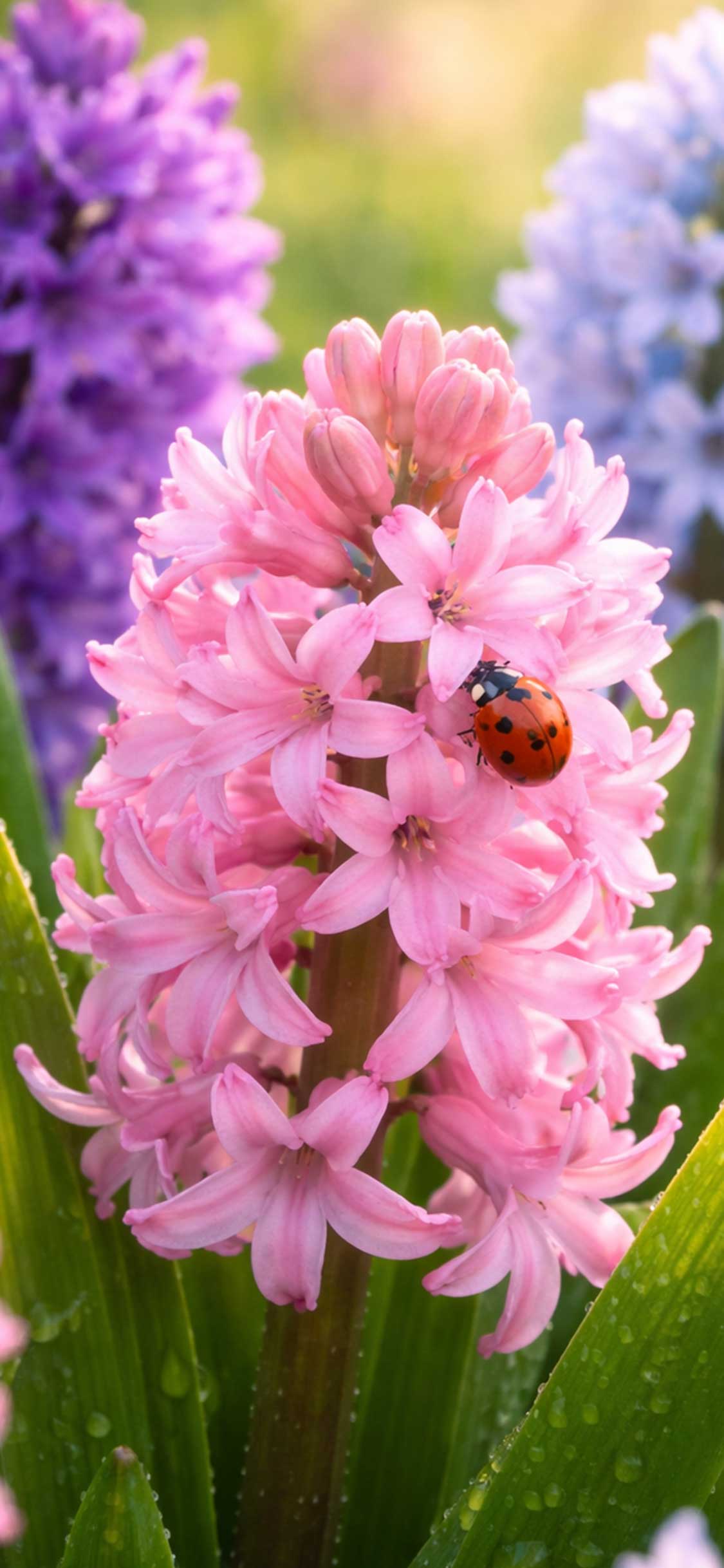 てんとう虫がとまったピンクのヒヤシンスの画像は、幸運やうれしい知らせを感じさせる待ち受けです。てんとう虫は昔から縁起のよい虫として親しまれてきたため、恋愛では「思いがけない良い出来事」「待っていた連絡」「恋の流れが好転するきっかけ」といった前向きな意味を重ねやすいです。